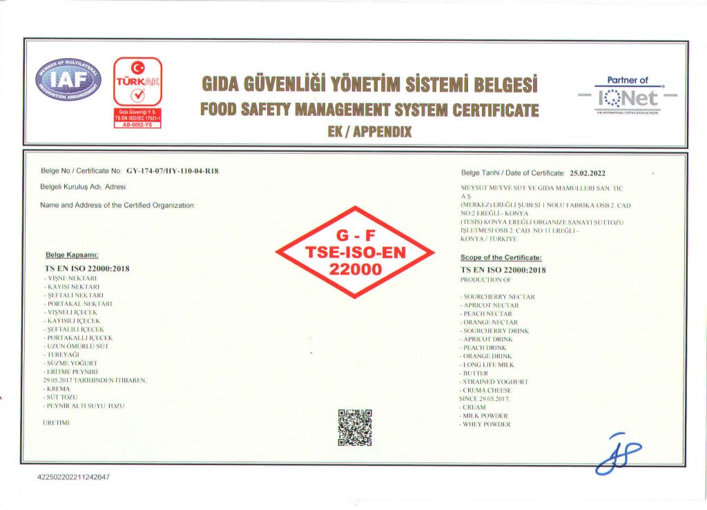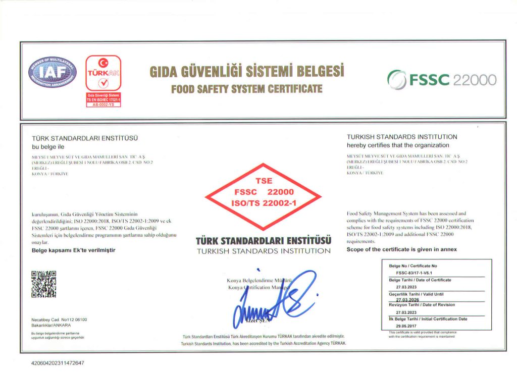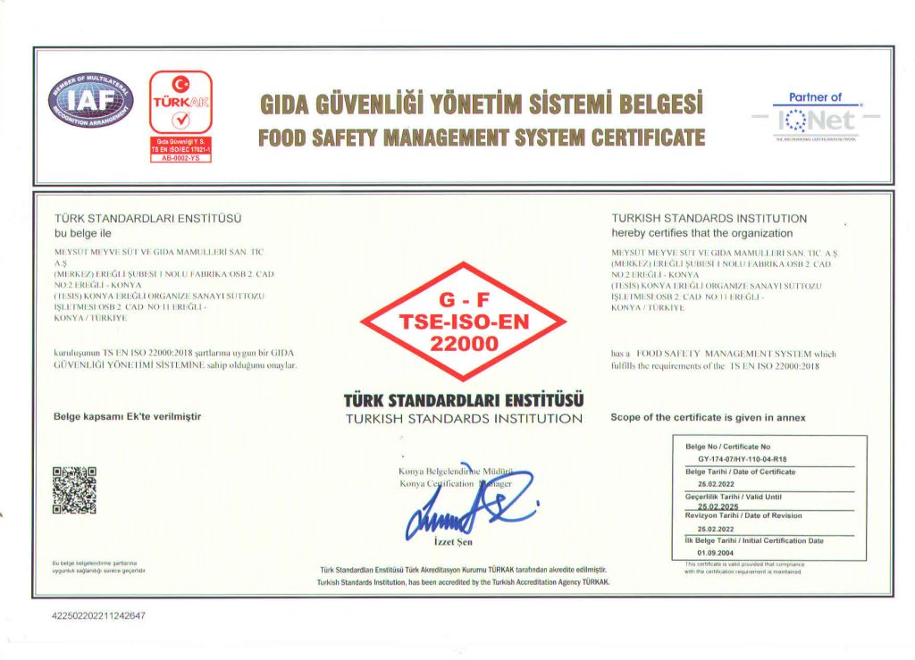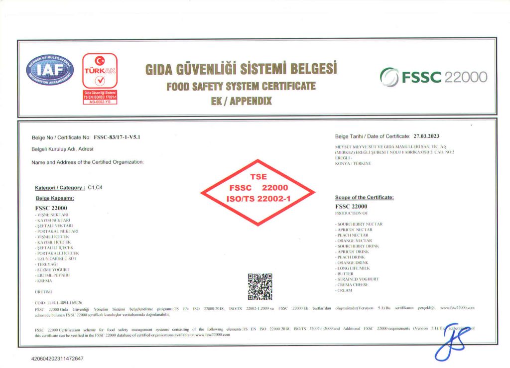 Gıda Güvenliği Politikası’nda, Süt ve Süt Ürünleri ile Meyve Suyu üretiminde kalite ve güvenlik anlayışıyla müşteri memnuniyetini ön planda tutan, doğal hammaddelerin en kıymetlisi olan sütün, doğallığını bozmadan, meyvelerin doğadaki tazeliğini muhafaza ederek; yüksek kalite eksenli, hijyen esaslı, çevreci ve çalışma yaşamını koruyan bir üretim anlayışıyla mevcut pazar payını artırmayı hedefleyen, işçi-işverenmüşteri memnuniyetini sağlayarak ürünlerimizi dünya markası yapmak hedefimizdir.