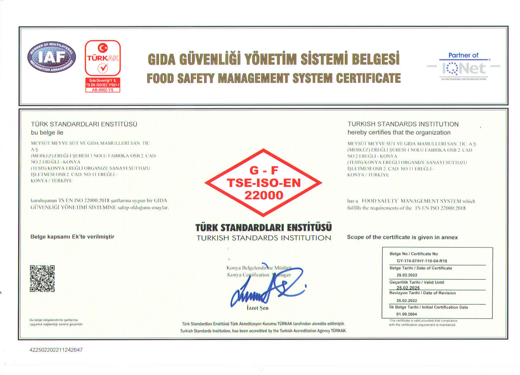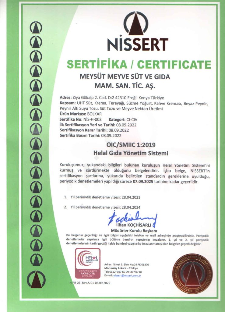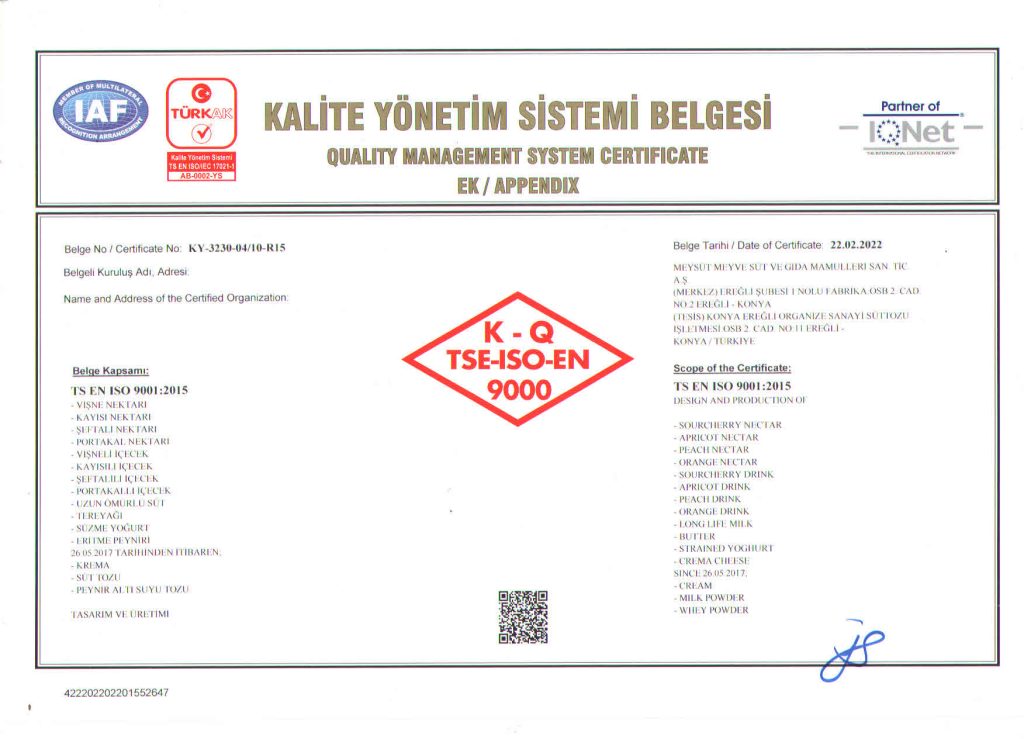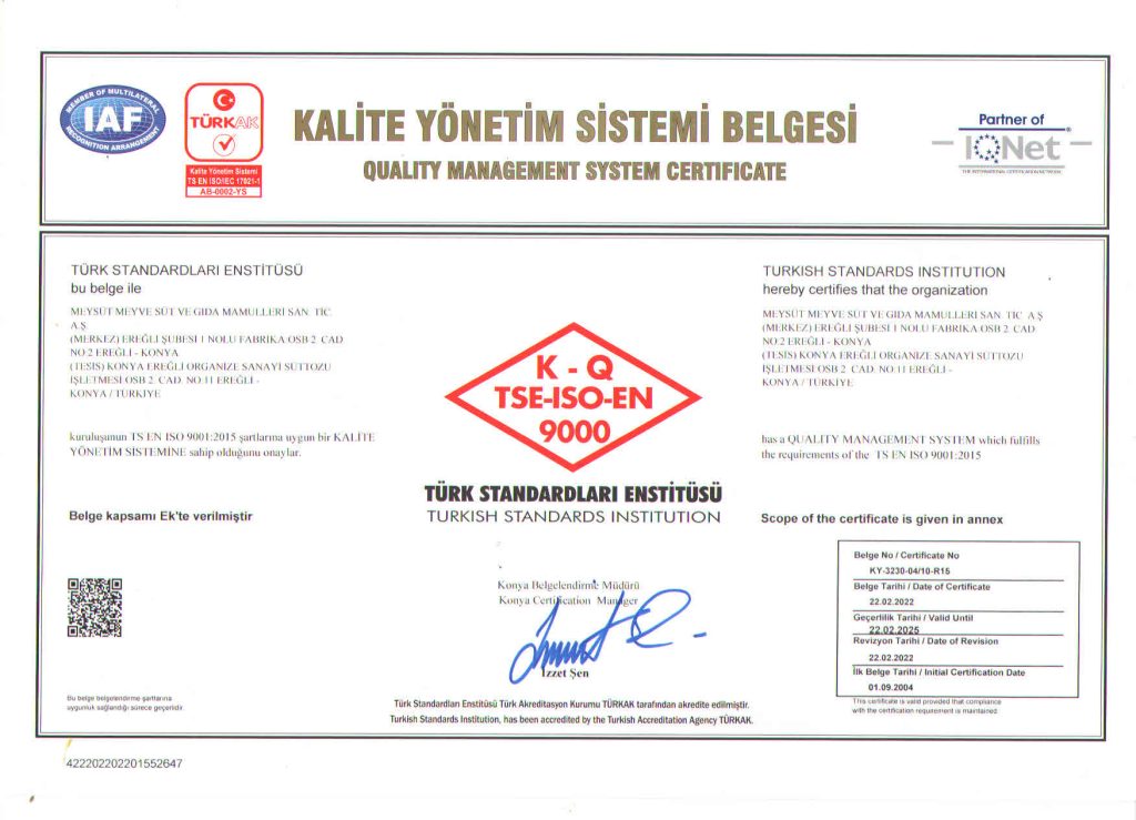 Gıda Güvenliği Politikası’nda, Süt ve Süt Ürünleri ile Meyve Suyu üretiminde kalite ve güvenlik anlayışıyla müşteri memnuniyetini ön planda tutan, doğal hammaddelerin en kıymetlisi olan sütün, doğallığını bozmadan, meyvelerin doğadaki tazeliğini muhafaza ederek; yüksek kalite eksenli, hijyen esaslı, çevreci ve çalışma yaşamını koruyan bir üretim anlayışıyla mevcut pazar payını artırmayı hedefleyen, işçi-işverenmüşteri memnuniyetini sağlayarak ürünlerimizi dünya markası yapmak hedefimizdir.